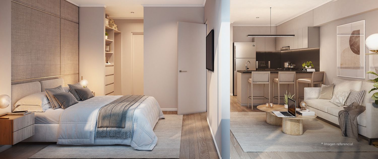 Todas las imágenes, planos, medidas y áreas son referenciales por lo que podrían sufrir cambios al momento de desarrollarse el proyecto, asimismo los elementos decorativos acabados y mobiliarios son propuestas del departamento de diseño que no se incluyen en la oferta comercial y no comprometen a la empresa inmobiliaria.
